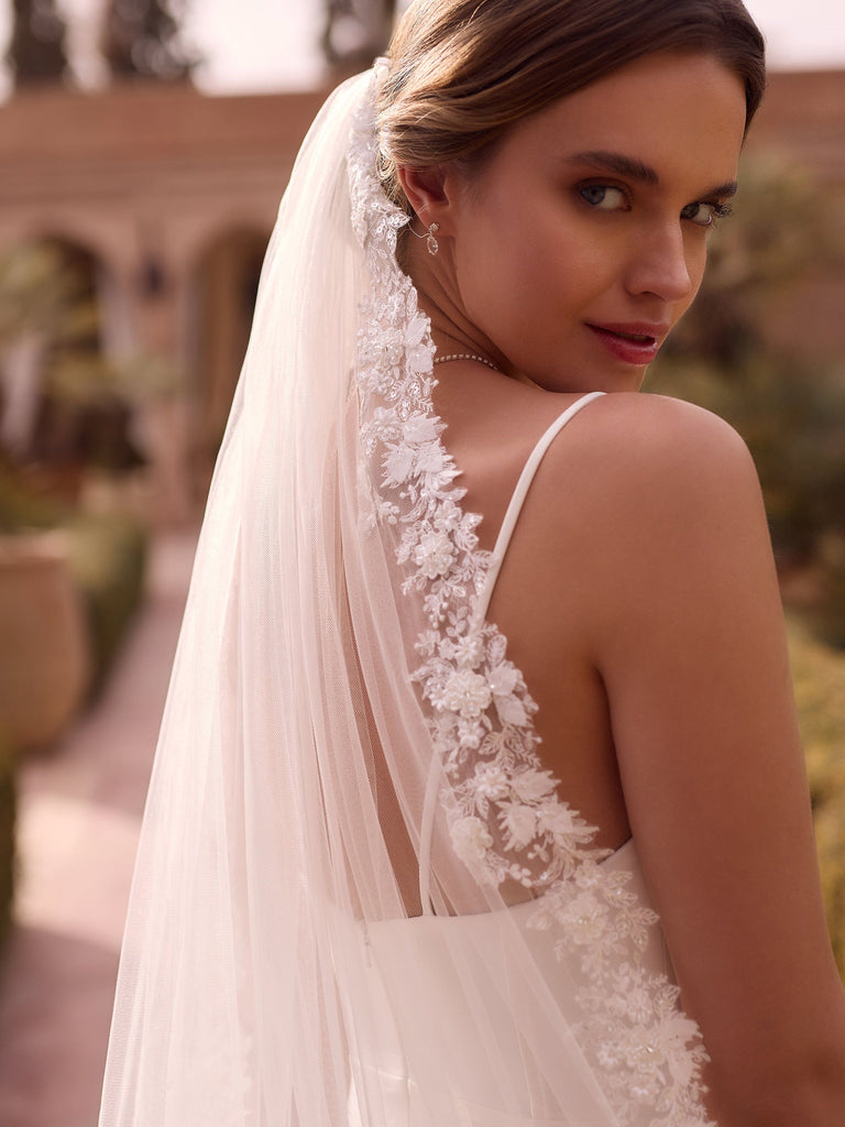 En väldigt romantisk brudslöja från Bianco Evento (S 535). 250 cm lång slöja med tyll och makalöst vacker spetskant, färgen ivory/elfenben/benvit